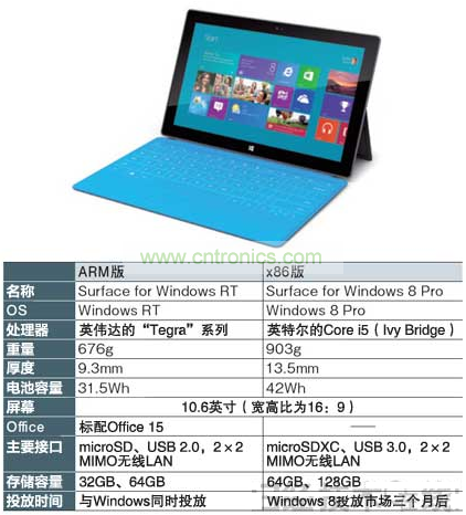 微軟的平板終端名為“Surface”,微軟讓W(xué)indows 8平板終端繼承了支持觸摸操作的桌面型計算機的名稱。新款終端備有配備ARM架構(gòu)SoC的“Surface for Windows RT”,以及配備x86處理器的“Surface for Windows 8 Pro”兩款機型,前者將與Windows 8同時上市(圖1)。
