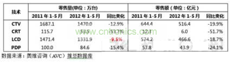2012年1~5月彩電市場量額齊跌,液晶電視銷量同比下降9.5%。視像協(xié)會(huì)與AVC聯(lián)合發(fā)布的數(shù)據(jù)顯示,1-5月彩電內(nèi)銷量為1470萬臺(tái),同比下降12.9%;銷售額516.4億元,同比下降19.9%。其中,液晶電視1331.9萬臺(tái),同比下降9.5%,銷售額為466.6萬元,同比下降18.7%。(見圖1)