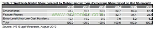 今年智能手機(jī)出貨與與市場(chǎng)份額強(qiáng)勁擴(kuò)張,將首次成為領(lǐng)先的手機(jī)類型,而且未來幾年出貨量將保持兩位數(shù)的增長(zhǎng)速度。到2016年,智能手機(jī)將占總體手機(jī)市場(chǎng)的67.4%,如表1所示。
