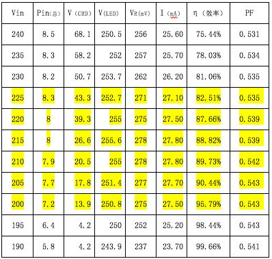 下面舉一個(gè)實(shí)測的結(jié)果為例,這是一個(gè)80顆3014串聯(lián)的球泡燈,采用了5顆Semitek 的S-562T并聯(lián)。它在不同的輸入市電電壓時(shí),所測得的結(jié)果如下表所示。