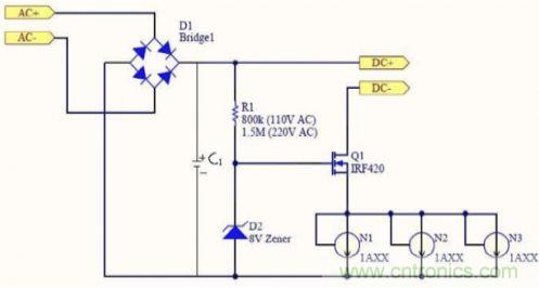 在這里,恒流二極管的作用就是要在輸入市電電壓變化時(shí),保持輸出電流不變。但是由于恒流二極管的耐壓有一定的限制,所以它所能吸收的電源電壓變化也是有限 的。就拿100V耐壓的CRD來說,用在220V市電電源里,都還只能對付有限的電壓變化。220V經(jīng)過橋式整流以后它的輸出直流電壓大約為264V。如 果市電變化+10%,~-15%,就相當(dāng)于整流后為290~187V,電壓變化103V。已經(jīng)超過其耐壓了。假如所用的LED為80顆,那么總電壓為 264V,正好相當(dāng)于220V經(jīng)過橋式整流以后的值。這時(shí)候恒流二極管上沒有壓降,但是這時(shí)候它是不能工作的而至少需要10V壓降,也就是要求整流后電壓 為274V,市電電壓為228VAC。那時(shí)候恒流二極管壓降為最小,功耗也最小,只有0.03Ax10V=0.3W,整體效率為最高可達(dá)96%(當(dāng)然還要 考慮整流器的效率,實(shí)際上還會(huì)低一些)。如果市電增高至242VAC,那么恒流二極管電壓就增高為26.4V,其功耗也增加到0.79W,這時(shí)候效率就等 于91%。