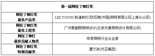 2013年6月9日,在廣州國際照明展覽會開幕式晚宴上,同時舉行了“阿拉丁神燈獎”大型頒獎盛典,現(xiàn)場宣布了評選的最終賽果,并頒發(fā)了相關的獎項。
