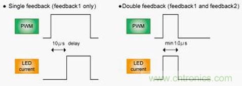 圖4為LED電流在有無與輸出不同的反饋通路時(shí)對(duì)PWM信號(hào)的跟隨性如何變化的比較數(shù)據(jù)。