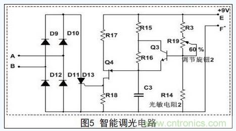 當(dāng)LED照明設(shè)備開始工作后,本文設(shè)計(jì)的智能開關(guān)會依據(jù)環(huán)境照明情況的變化,通過智能調(diào)光電路自動(dòng)地改變照明設(shè)備的亮度。圖1所示的智能調(diào)光電路接口A、B接入的電路如圖5所示。