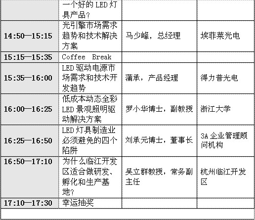 到目前為止,已邀請到的演講嘉賓包括:明微副總經理李照華、占空比銷售總監(jiān)李明峰、昂帕CEO許明偉博士、士蘭微董事長陳向東、DesignLed技術總監(jiān)許崢嶸、晟碟總經理陳亨由、埃菲萊總經理馬少峰、三星LED總經理唐國慶、飛泰科技董事長董沛、iSuppli LED照明市場分析師Alice Tao、3A企業(yè)管理顧問機構董事長劉承元博士、德力普產品經理蒲承、浙江大學羅小華教授、杭州臨江高新開發(fā)區(qū)常務副主任吳立群教授。