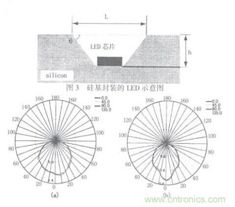 MEMS技術(shù)是隨著半導(dǎo)體和微電子技術(shù)的發(fā)展麗發(fā)展起來的一項新興的細(xì)微加工技術(shù),加工尺寸從毫米到微米數(shù)量級,甚至亞微米的微小尺寸:其加T藝主要分為表面工藝和體工藝。基于硅基的體工藝又稱為體硅工藝,體硅工藝呵以在硅基體上形成高深寬比的凹稽。由于MEMS的加工尺寸很小,因此利用該技術(shù)形成的微小凹槽作為LED芯片封裝的反射腔(如圖3),將會克服目前LED芯片直接封裝在PCB板上而引起發(fā)光效率低的問題;同時由于硅具有良好的導(dǎo)熱特性,因此可以降低目前封裝中熱阻高的問題,從而提高LED芯片的發(fā)光效率和可靠性。圖4(a)和(b)給出了當(dāng)LED芯片直接貼裝在PCB板上和貼裝在有凹槽的硅基上的發(fā)光特性。從圈中可以看出,LED貼裝在帶有凹槽的硅基上以后其發(fā)出光的發(fā)散性能得到了很大的改善,LED的發(fā)光強(qiáng)度提高了75%以上。