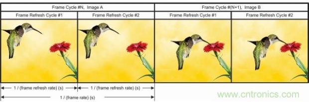 為滿(mǎn)足更快運(yùn)行這一要求,很多LED顯示系統(tǒng)都在一個(gè)幀周期內(nèi)反復(fù)顯示相同的影像,稱(chēng)為幀刷新率。圖10是幀速率與刷新率的關(guān)系。只有兩張幀影像:A 和 B。每個(gè)幀重復(fù)“影像 x”兩次。因而本實(shí)例“幀刷新率”= 2 ד幀速率”。