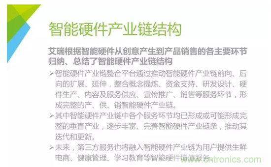 作為此次系列報(bào)告的開篇,京東智能與艾瑞對(duì)當(dāng)前智能硬件的產(chǎn)業(yè)鏈結(jié)構(gòu),發(fā)布了行業(yè)報(bào)告《2015中國(guó)智能硬件產(chǎn)業(yè)系列研究報(bào)告——產(chǎn)業(yè)鏈圖譜篇》該圖譜對(duì)現(xiàn)階段的智能硬件的發(fā)展趨勢(shì)進(jìn)行了劃分和定義,并對(duì)產(chǎn)業(yè)鏈的結(jié)構(gòu)進(jìn)行了分析。