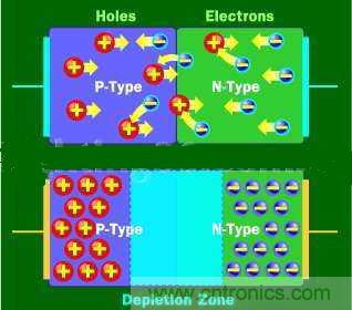 因此,電子空穴本身就顯示出是從正電區(qū)域流向負(fù)電區(qū)域。二極管是由N型半導(dǎo)體物質(zhì)與P型半導(dǎo)體物質(zhì)結(jié)合,每端都帶電子。這樣排列使電流只能從一個(gè)方向流動(dòng)。當(dāng)沒(méi)有電壓通過(guò)二極管時(shí),電子就沿著過(guò)渡層之間的匯合處從N型半導(dǎo)體流向P型半導(dǎo)體,從而形成一個(gè)損耗區(qū)。在損耗區(qū)中,半導(dǎo)體物質(zhì)會(huì)回復(fù)到它原來(lái)的絕緣狀態(tài)--所有的這些“電子空穴”都會(huì)被填滿,所有就沒(méi)有自由電子或電子真空區(qū)和電流不能流動(dòng)。