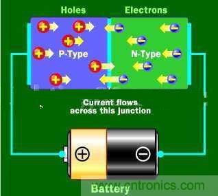 為了除掉損耗區(qū)就必須使N型向P型移動(dòng)和空穴應(yīng)反向移動(dòng)。為了達(dá)到目的,連接二極管N型一方到電流的負(fù)極和P型就連接到電流的正極。這時(shí)在N型物質(zhì)的自由電子會(huì)被負(fù)極電子排斥和吸引到正極電子。在P型物質(zhì)中的電子空穴就移向另一方向。當(dāng)電壓在電子之間足夠高的時(shí)候,在損耗區(qū)的電子將會(huì)在它的電子空穴中和再次開(kāi)始自由移動(dòng)。損耗區(qū)消失,電流流通過(guò)二極管。