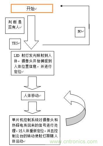 系統(tǒng)初始化之后,對狀態(tài)進行判斷,若沒檢測到人,則一直處于檢測狀態(tài);若檢測到有人,則單片機控制IO口打開開關(guān)使得LED射燈發(fā)光照射到人體,攝像頭開始捕捉人體位置信息,并進行定位;當人體移動時,單片機控制系統(tǒng)對熱釋電和攝像頭傳回來的信號進行處理,對人體重新進行定位,并且控制云臺轉(zhuǎn)動使射燈跟隨人體運動;當人體再移動,便繼續(xù)“人體移動----數(shù)據(jù)處理---轉(zhuǎn)動云臺”這個循環(huán)過程。