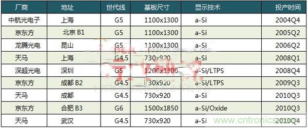 5代線(玻璃基板尺寸為1100mmx1300mm)有4條,均已于2008年之前成熟量產(chǎn),包括京東方(北京)、中航光電子(上海)、龍騰光電(昆山)和深超光電(深圳)各1條;