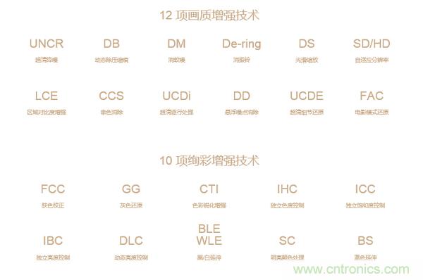 當(dāng)然,它也關(guān)畫質(zhì)有那么一點(diǎn)事。因?yàn)榇蟛糠值碾娨旳RM芯片也都集成了畫質(zhì)引擎技術(shù),比如下圖所出現(xiàn)的,有百分之九十的人都不會(huì)看完的各種高大上的技術(shù)術(shù)語。不要以為這些技術(shù)很牛,是電視廠商搞出的什么新鮮玩意兒,其實(shí)這只是一個(gè)多合一芯片集成了所有的接口,也就是說只要是同一芯片方案的電視機(jī)連底層程序都是一樣的,沒有絲毫的獨(dú)特性。