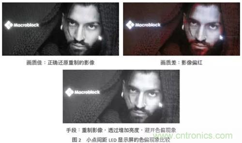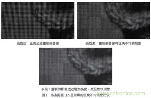 在室內應用中,LED顯示屏的亮度多介于300到1000尼特(nit),將此亮度轉換成LED順向電流,約當于1~5mA,甚至小于1mA。因此,驅動芯片的小電流集中度變得很重要。當驅動芯片電流精度不佳,小點間距LED顯示屏就容易出現(xiàn)區(qū)塊不均的色塊,然而為掩飾色塊這個缺陷,通常會采取提高LED電流這個手段,來增加顯示屏的亮度。但帶來的缺點是,當觀眾注視這個LED顯示屏一段時間后,眼睛容易感覺不適。圖1所演示的是小點間距LED顯示屏,在使用不同質量的LED驅動芯片時,重制圖像后的實際差異。