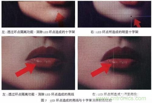 一個好的小點間距LED顯示屏必須要能消除因LED壞點所造成惱人的亮線或十字架現(xiàn)象,如圖7左圖所示。唯有采用具有“壞點隔離”功能(dead pixel isolation)的LED驅動芯片,才能維持小點間距LED顯示屏的正常運作,并可方便用戶彈性安排維修時程。