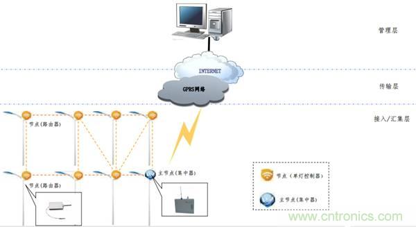 下行:通過zigbee無線方式和控制節(jié)點(diǎn)(單燈)通信;上行:通過GPRS等方式與監(jiān)控中心通信;