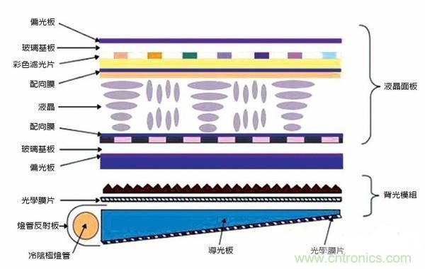 我們先來看看歷史已久的LCD顯示技術,LCD顯示屏結(jié)構(gòu)非常復雜,LCD 的構(gòu)造是在兩片平行的玻璃基板當中放置液晶盒,下基板玻璃上設置TFT(薄膜晶體管),上基板玻璃上設置彩色濾光片,通過TFT上的信號與電壓改變來控制液晶分子的轉(zhuǎn)動方向,從而達到控制每個像素點偏振光出射與否而達到顯示目的。