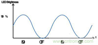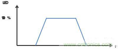 我們在本文開始處通過筆記本電腦的電源鍵為例簡單介紹了一下呼吸效應(yīng)。持續(xù)地逐漸提升或逐漸下降兩級之間的占空比能讓LED形成“呼吸”的效果,如圖6所示。待機模式下電源按鍵支持呼吸效應(yīng)能告訴用戶電源按鍵是活動狀態(tài)并能進行操作。