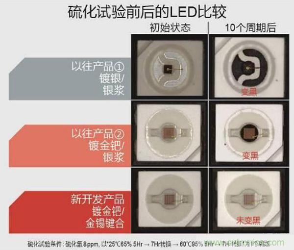 在硫化試驗(yàn)中,以往使用鍍銀框架及銀漿的產(chǎn)品的光通量在一個周期(24小時)后為70%,10個周期后為60%,時間越長其光通量越低;而新產(chǎn)品可在10個循環(huán)(240小時)后依然保持幾乎100%的高光通量 。