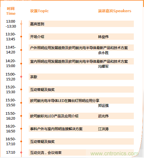 本次研討會特邀新曄電子市場總監(jiān)林俊偉、歐司朗光電半導(dǎo)體通用照明事業(yè)部市場工程師余永勝、歐司朗光電半導(dǎo)體市場部經(jīng)理馮耀軍、歐司朗光電半導(dǎo)體多元市場事業(yè)部中國區(qū)市場工程師鄭運(yùn)強(qiáng)、歐司朗光電半導(dǎo)體通用照明事業(yè)部高級應(yīng)用工程師遲光偉、泰科工業(yè)事業(yè)部亞太區(qū)資深照明領(lǐng)域產(chǎn)品經(jīng)理江洪濤等,他們將在現(xiàn)場為大家具體解讀LED舞臺照明領(lǐng)域的最新技術(shù)進(jìn)展與市場趨勢。