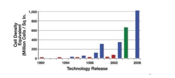 圖2顯示了Fairchild公司≤30V的N溝道MOSFET單元密度的進(jìn)步。每個(gè)條形都表示新的工藝進(jìn)步??梢钥吹?,在最近的十年中,單元密度從3200萬單元/平方英寸增加到現(xiàn)在的10億單元/平方英寸。