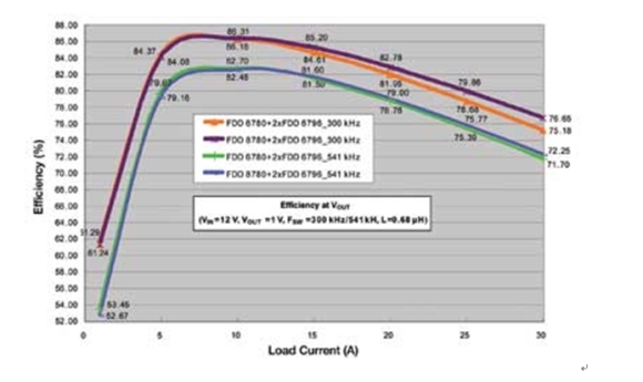注意上面的兩條曲線,在滿載(30A)時(shí),可以看到最新的器件的效率有1.5%的改進(jìn)。同樣還是這兩條曲線,在負(fù)荷較小(15A)時(shí),可以實(shí)現(xiàn)0.69%的改善。如果對整個(gè)負(fù)荷范圍積分,那么與今天常見的方案相比,使用最新的MOSFET器件時(shí)平均功率損耗可以降低8%~10%。即使在較高的開關(guān)頻率541kHz處,可以看到在負(fù)荷小時(shí)系統(tǒng)級效率仍然高于80%,而在滿載時(shí)效率大于70%。如果頻率繼續(xù)增加,那么開關(guān)損耗將急劇增加。