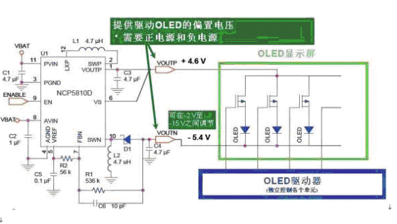 圖5:安森美半導(dǎo)體AMOLED穩(wěn)壓電源IC NCP5810D的功能框圖。