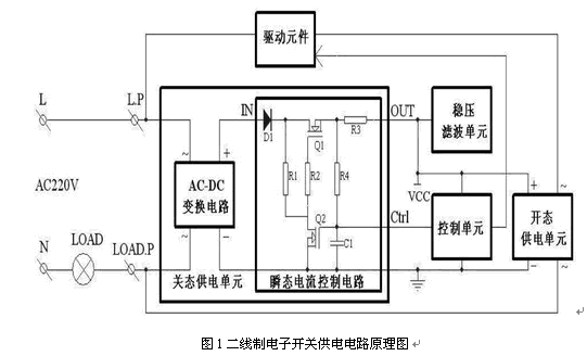 基于以上問題,本文提供了一種用于二線制電子開關(guān)的供電電路,在開關(guān)關(guān)閉時(shí)給控制電路提供很小的電流,用以維持待機(jī)工作,開關(guān)開啟的瞬間,先由控制單元控制關(guān)態(tài)供電單元,提供較大的工作電流給控制單元和驅(qū)動(dòng)元件,使開關(guān)開啟,然后轉(zhuǎn)入開態(tài)供電狀態(tài)。當(dāng)開關(guān)關(guān)閉時(shí),控制單元控制關(guān)態(tài)供電單元提前進(jìn)入大電流工作狀態(tài),迅速補(bǔ)充開關(guān)關(guān)閉瞬間控制單元和驅(qū)動(dòng)元件消耗的功率,使電源濾波電容兩端的電壓維持在額定值。有效地解決了負(fù)載燈具閃爍的問題。