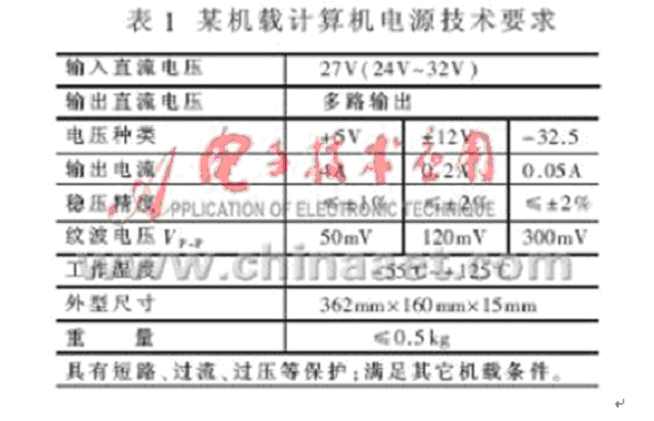 小體積、輕重量、高可靠性、高效率是航空電源始終追求的目標。隨著微電子技術的發(fā)展,采用大規(guī)模和超大規(guī)模集成電路的機載計算機主機已越來越小型化,這就對其電源部件的體積和重量提出了進一步小型化的要求。機載計算機是一種抗惡劣環(huán)境的計算機,其電源部件也必須滿足抗惡劣環(huán)境的要求,例如必須適應-55℃~+125℃的環(huán)境溫度和較寬范圍的輸入電壓;同時還要耐振動、耐撞擊、抗電磁干擾等。