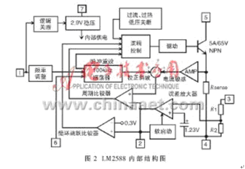 LM2588采用7腳TO-220封裝,主要包括100kHz振蕩器、2.9V穩(wěn)壓電路、誤差放大器、5A/65V的NPN開關管以及過流、過熱、低電壓鎖定,還包括軟啟動、邏輯關斷、邏輯控制等,內(nèi)部結構如圖2所示。