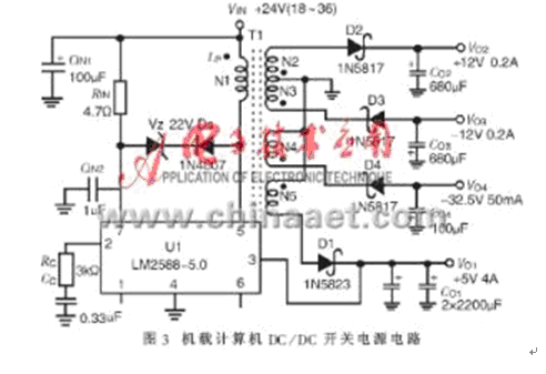 U1為控制器LM2588-5.0。脈沖變壓器T1共有五個繞組:N1為初級繞組,N2、N3、N4、N5為次級繞組,分別對應輸出+12V@0.2A、-12V@0.2A、-32.5V@0.05A以及+5V@4A,且N2、N3圈數(shù)相同。