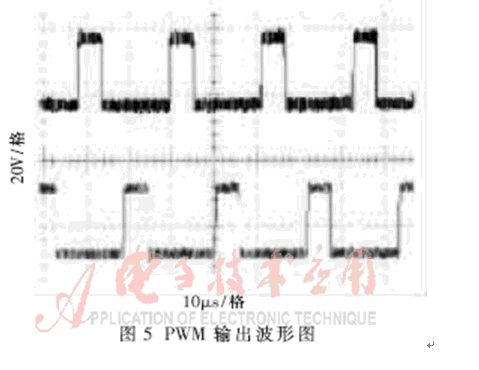 在以IGBT設(shè)計(jì)的逆變電源中,PWM控制電路是極其重要的組成部分,SG3525脈寬調(diào)制型控制器作為SG3524的改進(jìn)型,更適合于開(kāi)關(guān)器件的雙端DC-DC變換器,它的外圍電路原理圖如圖4所示,輸出波形如圖5所示。