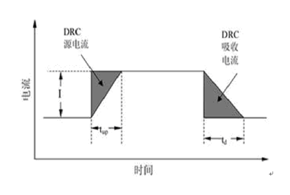 假定DRC電路遠遠快于變換器,則DRC的工作時間取決于DC/DC變換器的電流改變速率Sr,并可分為不同的電流上升速率(Sru)及下降速率(Srd)。現(xiàn)在,我們研究一個負載電流脈沖期間