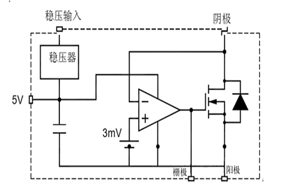 實現(xiàn)與兩端整流器功能相當?shù)钠骷仨毎ㄒ粋€MOSFET,一個控制該器件以及內(nèi)部偏置電源的非??焖偾曳浅C舾械碾娐贰_@樣的電路如圖1所示。