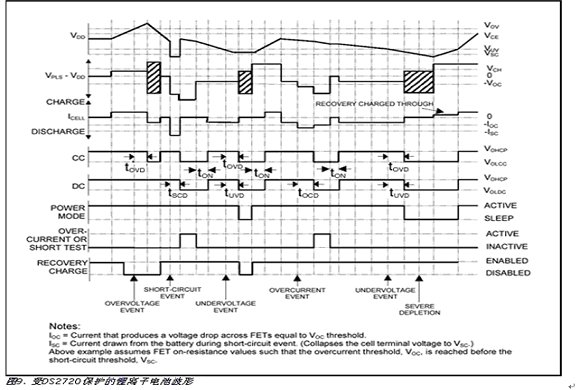a 過壓 如果在VDD檢測的電池電壓超過過壓閾值VOV時間大于過壓延遲時間tOVD,則DS2720關(guān)閉充電FET,并將保護寄存器的OV置位。在過壓期間,放電通路保持開放。除非被另外保護條件鎖定,當(dāng)電池電壓降到充電使能閾值VCE以下或由于放電導(dǎo)致VDD-VPLS>VOC時,充電FET被重新使能。