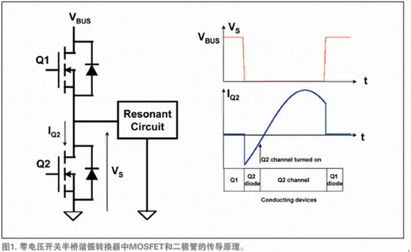 圖1所示為零電壓開關半橋諧振轉換器中MOSFET和體二極管的傳導原理。在這種轉換器中,電流波形滯后于電壓。假設Q1開通,Q2關斷。Q1傳導諧振電流。在一定時間之后,由控制環(huán)路決定,Q1關斷。這時,諧振電流流經(jīng)Q2的體二極管。在負電流期間的某一時刻,Q2導通,減小傳導損耗。當其上電壓為體二極管的正向電壓時(遠小于總線電壓),Q2導通。這就是有效的零電壓開關。Q2中的諧振電流反向。在一定時間之后,同樣由控制環(huán)路決定,Q2關斷。當大電流流過,且Q2的電壓擺幅接近總線電壓時,這種關斷順序并非低損耗。