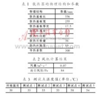 軟件計(jì)算結(jié)果:表1為散熱器的物理結(jié)構(gòu)和參數(shù);表2為風(fēng)機(jī)的風(fēng)量和風(fēng)壓計(jì)算結(jié)果;表3為散熱器上選擇的五個測試點(diǎn)的溫度值。
