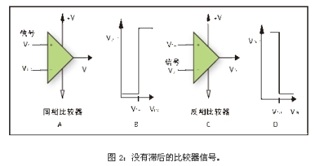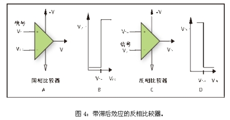 圖1B和1D給出了比較器電路的轉(zhuǎn)換函數(shù)。同相比較器被定義為在輸入信號大于門限電壓時輸出為正的比較器,而反相比較器被定義為輸入信號大于門限電壓時輸出為負(fù)的比較器。