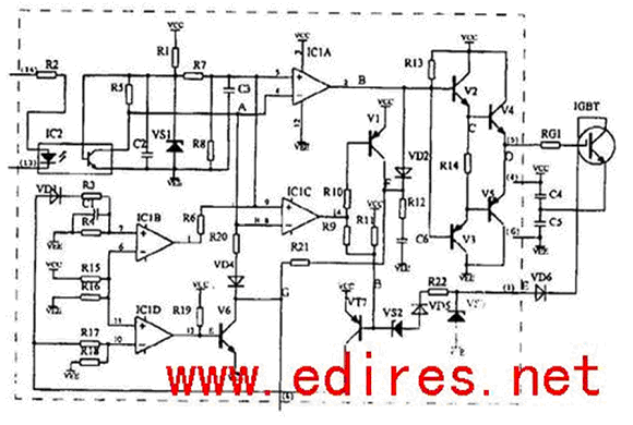在M57962L輸入端13和14無(wú)電流時(shí),IC1截止,A點(diǎn)電位上升使IC2A的2腳變?yōu)榈碗娢?,則使V3、V5導(dǎo)通,V2、V4截止。lGBT的門(mén)極(GATE)通過(guò)V5導(dǎo)通到VEE,而使IGBT關(guān)斷。IC2C的14腳輸出為低電平, 使V1、V7導(dǎo)通, 使IC2B、IC2D保持原先狀態(tài)不變。