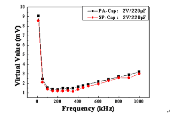 如上面的濾波效果顯示,當開關(guān)電源頻率在300KHz左右時,同種規(guī)格的PA-Cap的輸出均方根與SP-Cap的很接近,所以PA-Cap濾波效果基本接近于SP-Cap。由于具有低的ESR、允許的紋波電流大,所以PA-Cap也是DC/DC轉(zhuǎn)換器或開關(guān)電源輸出電容的優(yōu)選電容之一。