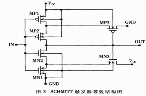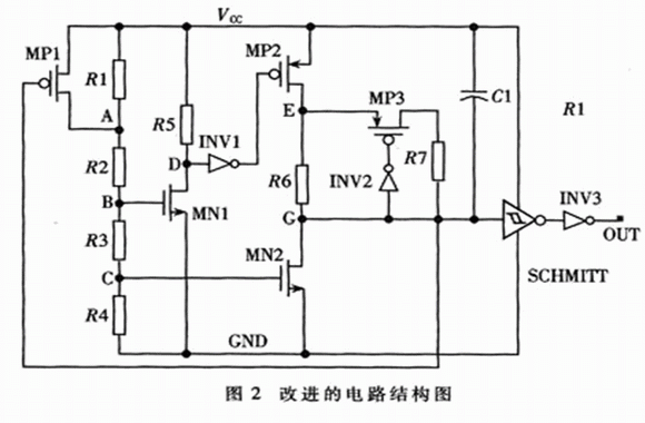 改進的電路如圖2所示,電路結(jié)構(gòu)由采樣、先導控制、比較器、遲滯反饋回路、加速響應電路、緩沖器六部分構(gòu)成。電阻R1、R2、R3、R4構(gòu)成分壓電阻網(wǎng)絡實現(xiàn)對Vcc的采樣;MNl、R5、INVl組成先導控制電路,實現(xiàn)對比較器灌電流的控制;MN2、R6、MP2組成比較器,實現(xiàn)采樣電壓與MN2的VTH比較;MP1構(gòu)成正反饋回路,可實現(xiàn)Vcc的遲滯功能;INV2、MP3、R7構(gòu)成正反饋回路,可加速比較器的翻轉(zhuǎn),從而提高電路的響應速度;SCHMITT觸發(fā)器和INV3是緩沖電路,對比較器的輸出波形進行緩沖和整形,SCHMITT觸發(fā)器的結(jié)構(gòu)如圖3所示,其工作原理詳見參考文獻[3];另外,電容C1起濾波和儲能作用。