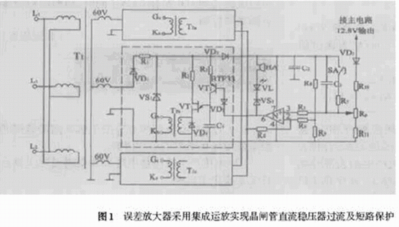 盡管功率場效應(yīng)VDMOS 和絕緣柵雙極型晶體管IGBT等電力半導(dǎo)體元器件層出不窮,且在電力電子技術(shù)領(lǐng)域占據(jù)重要位置,晶閘管(可控硅) 卻因耐高壓耐大電流沖擊的特性,仍有著穩(wěn)固的陣地,受到用戶的青睞。在擯棄電流采樣、放大和執(zhí)行等多個環(huán)節(jié)的情況下,將單結(jié)晶體管移相觸發(fā)器中的晶體管誤差放大器改為集成運算放大器,就可實現(xiàn)晶閘管直流穩(wěn)壓器的過流及短路保護,簡化了電路結(jié)構(gòu),并提高了整機的穩(wěn)定可靠性能和AC - DC變換效率。