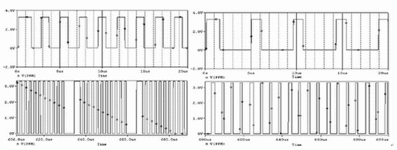 從模擬結果可以看出,此PFM控制電路的實現(xiàn)方式在輕負載下,可以有效降低轉換器的損耗,提高運行效率。