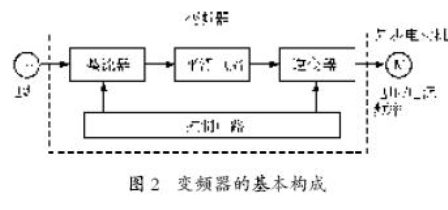 圖2所示為變頻器的基本構(gòu)成。它的基本原理是用一種特定的方式對(duì)變頻器中的晶閘管開(kāi)關(guān)進(jìn)行導(dǎo)通和關(guān)斷,直接把輸入的電壓波形“大致”調(diào)制成所需頻率的交流波形。
