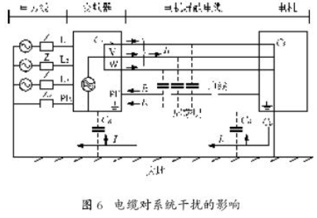 頻率范圍為150 kHz~30 MHz的電子干擾一般來(lái)自傳導(dǎo)。傳動(dòng)系統(tǒng)中范圍為30 MHz~1 GHz 的空間輻射干擾產(chǎn)生于逆變器,電機(jī)電纜及電動(dòng)機(jī)。由于電動(dòng)機(jī)電壓較高的dv/dt 以及電機(jī)電纜上的容性電流產(chǎn)生了漏電流,而且使用屏蔽的電機(jī)電纜也會(huì)增加漏電流,如圖6所示。