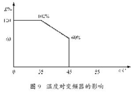 變頻器主要由各種電子元器件組成,它對(duì)于工作環(huán)境的要求較高,當(dāng)環(huán)境溫度超過(guò)它的最高工作溫度時(shí),變頻器必然會(huì)降低其持續(xù)電流輸出的額定值,如圖9所示。