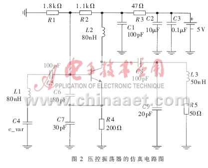 壓控振蕩器(VCO)是鎖相環(huán)路的重要組成部分。隨著電子技術(shù)的發(fā)展,出現(xiàn)了許多集成的VCO芯片??紤]到高頻率穩(wěn)定度、低相噪的要求,這里采用Agilent公司生產(chǎn)的低噪聲晶體管HBFP0450來設(shè)計VCO。常用的VCO一般有三種:晶體壓控振蕩器、LC壓控振蕩器和RC壓控振蕩器。對于超高頻段的VCO,采用LC振蕩器形式;為了提高頻率穩(wěn)定性,采用了克拉潑電路,并進(jìn)行了相角補(bǔ)償。