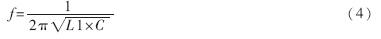 交流等效電路如圖3所示。L1、C4和C5串聯(lián)可以等效成一個電感,從而滿足電容三端振蕩器的相位條件。L1、C4、C5、C6、C7構(gòu)成了諧振回路,振蕩頻率主要由這五個元件所決定。頻率計算公式如下: