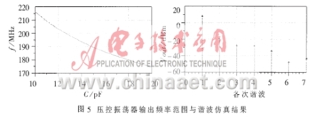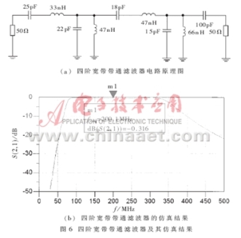 從圖5可以看出,壓控振蕩器的輸出頻率范圍為175MHz~217MHz,基波(頻率為214MHz時)輸出功率為7.911dBm,二次諧波為-16.368dBm,可見有效地抑制了諧波分量。在實際應(yīng)用中,對諧波濾除的要求比較高,可以在輸出端接入寬帶濾波器,其電路原理圖和仿真結(jié)果見圖6。這樣,可以更有效地濾除高次諧波,同時有利于輸出匹配,減小負(fù)載對輸出功率的影響。