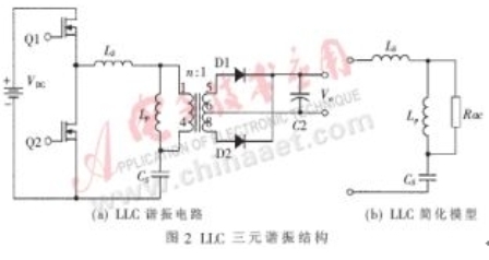 在二元件諧振網(wǎng)絡的基礎上,根據(jù)不同的應用可構(gòu)建不同種類的三元件的諧振網(wǎng)絡。三元件諧振網(wǎng)絡與二元件諧振網(wǎng)絡相比有很多優(yōu)點,比如在全負載范圍內(nèi)都具有較高的轉(zhuǎn)換效率,而且頻率變化范圍比較窄等。本文主要介紹和分析由三元件LLC構(gòu)成的諧振網(wǎng)絡,其結(jié)構(gòu)如圖2(a)所示。